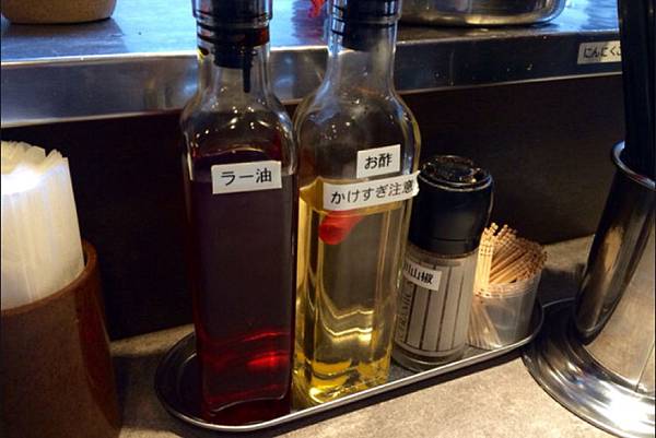 剛送上來建議先試試原本的味道,試過原味之後再慢慢隨個人喜好加上辣油跟醋。獨特的醬料瓶,不用擔心下手太重的問題。喜歡大蒜的朋友還可以試試老闆準備的蒜泥。